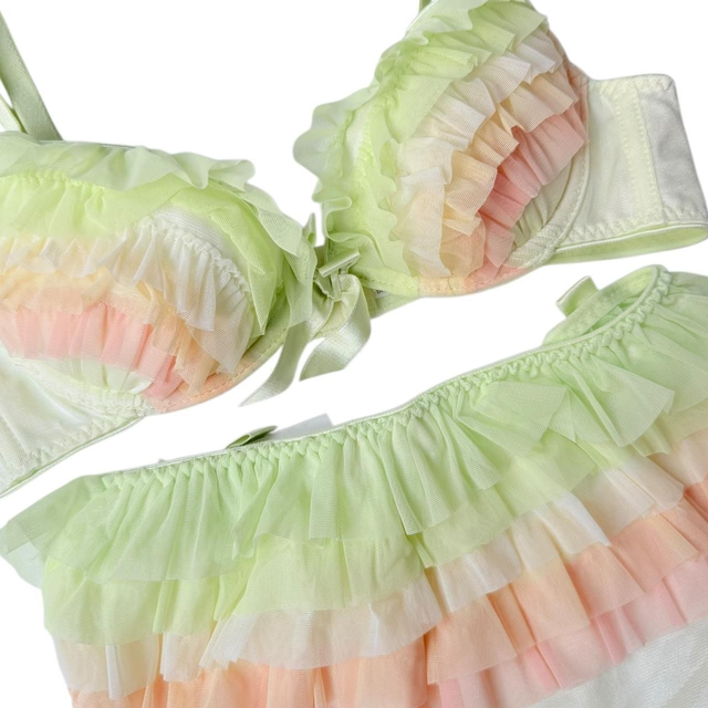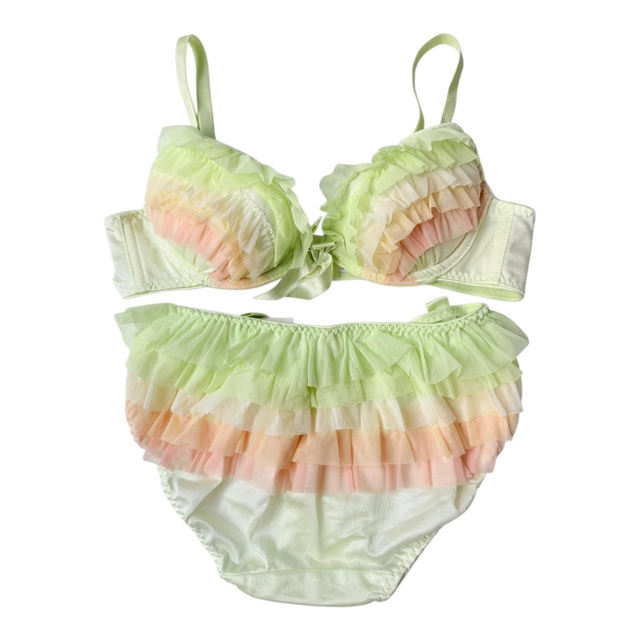Green multicolour frill Japanese Bra and Underwear set UK 32D, 32A