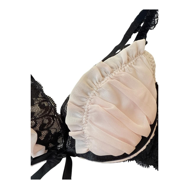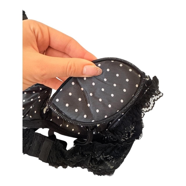 Japanese brand coquette black and pink glittery tulle embroidered bra with polka dot interior