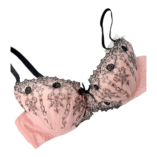Warm pink + black Floral Embroidered Japanese Bra UK 34C